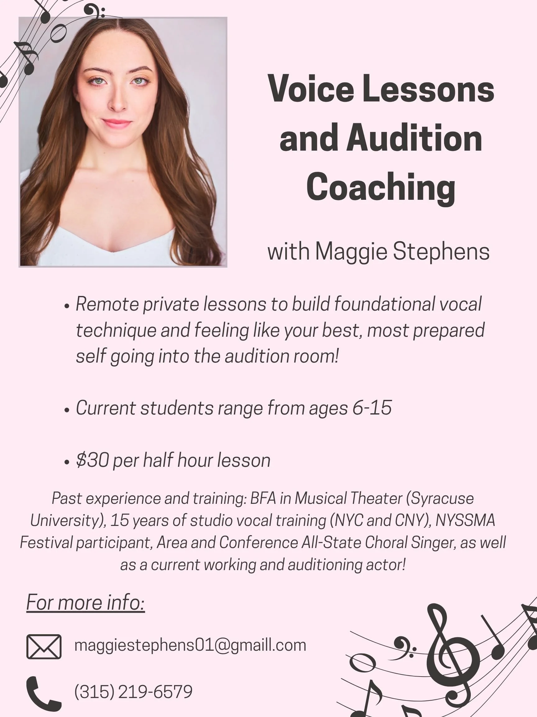 I have always loved working with kids and discovered a passion for teaching in 2019. I focus on the foundations of vocal performance and how to bring your most confident self into the audition room.